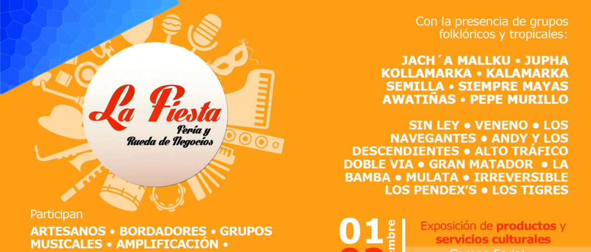 El Campo Ferial Chuquiago Marka albergará la primera versión de la “Fiesta, Feria y Rueda de negocios”, a realizarse del 1 al 3 de septiembre. El objetivo del evento, organizado por el Ministerio de Culturas y Turismo, es fomentar la ...